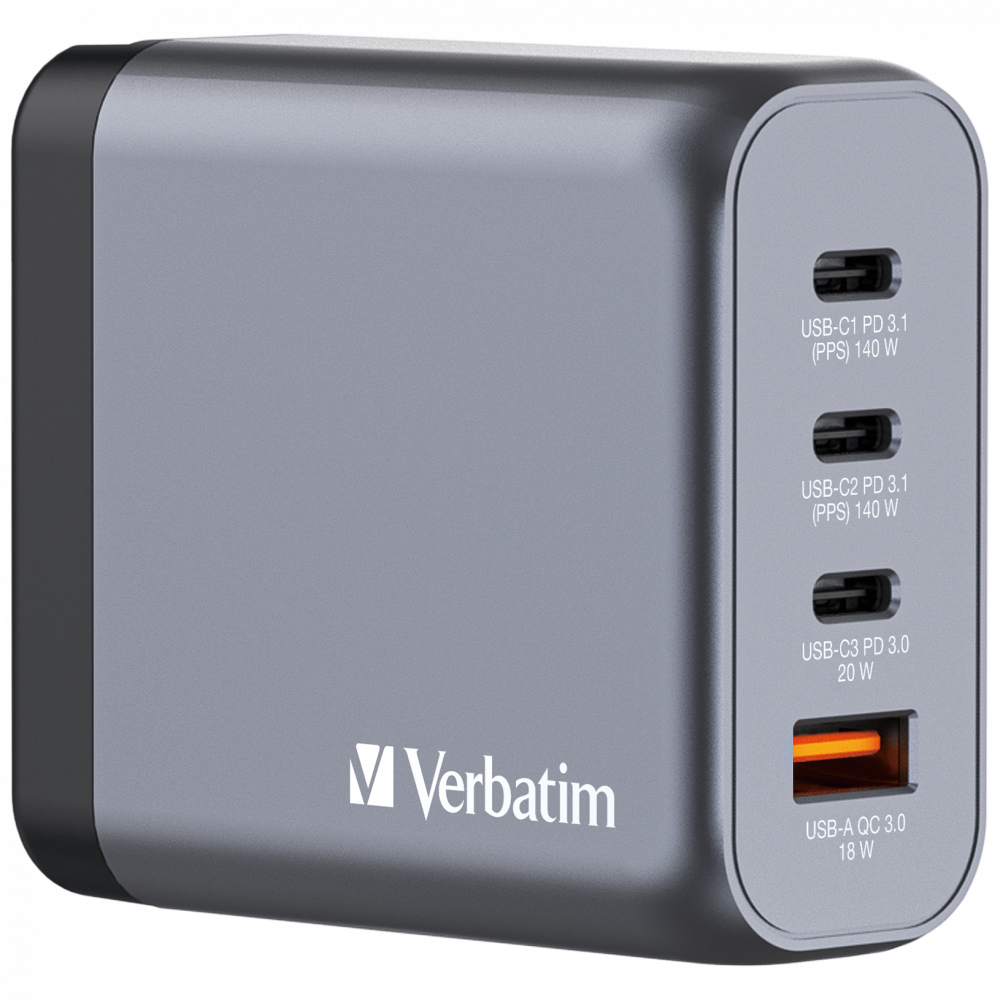 Verbatim GNC-140 GaN zidni punjač 140W, 4 priključka, 2 x USB-C PD 140 W / 1 x USB-C PD 20 W / 1 x USB-A QC 3.0